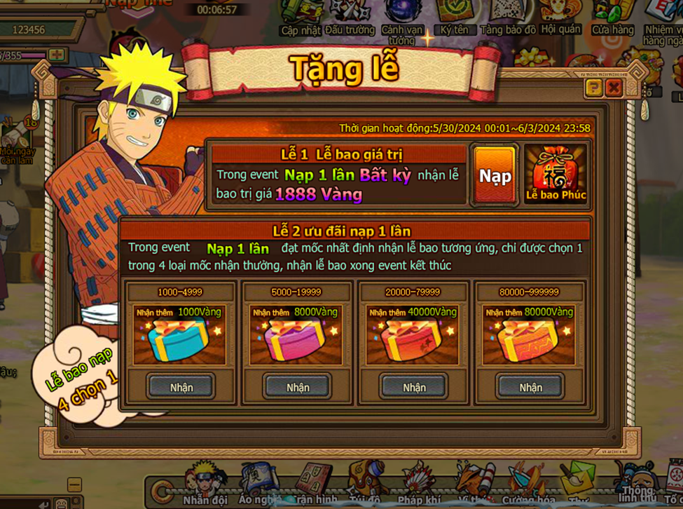Trong sự kiện này, Nạp Đơn đạt mốc nhất định nhận lễ bao tương ứng, chỉ được chọn 1 trong 4 loại mốc nhận thưởng, nhận lễ bao xong sự kiện kết thúc.