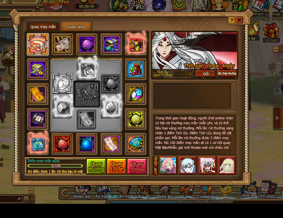 Trong thời gian hoạt động, người chơi online nhận cơ hội rút thưởng may mắn miễn phí, và có thể tiêu hao vàng và lễ kim rút thưởng. Mỗi lần rút thưởng vàng nhận 1 điểm tích lũy. Điểm Tích Lũy dùng để vật phẩm quý. Mỗi lần rút thưởng được 5 điểm may mắn. Đủ 100 điểm may mắn sẽ có 1 cơ hội quay Mật Bảo