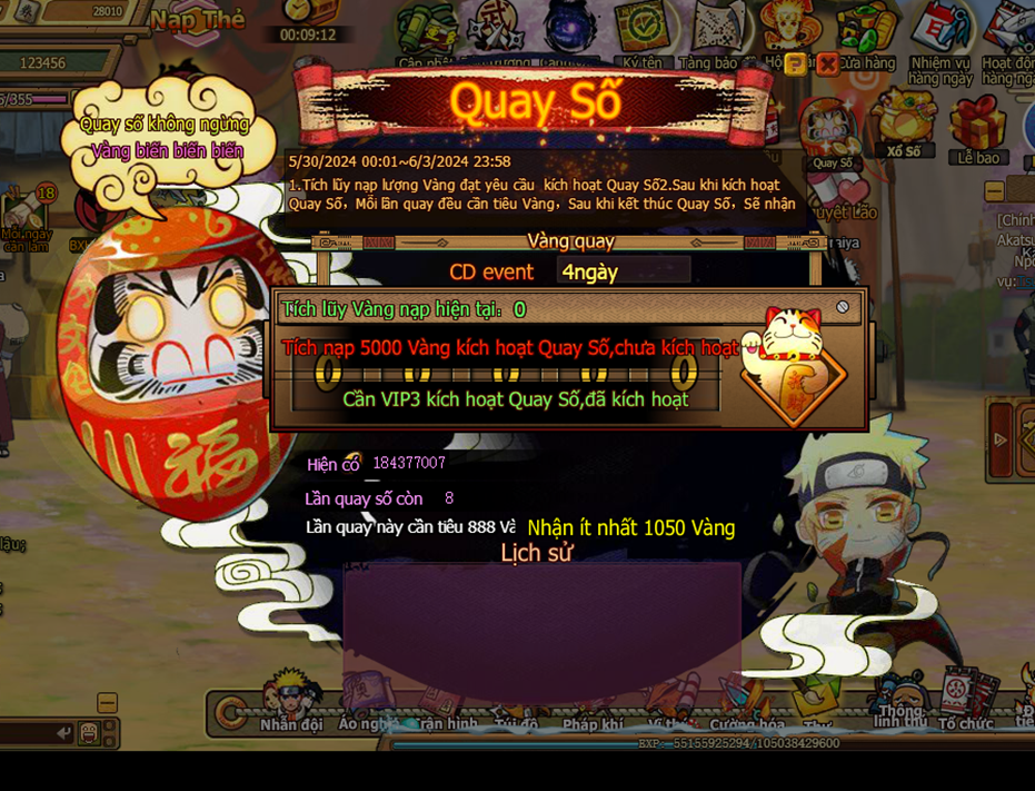 1. Tích lũy nạp lượng vàng đạt yêu cầu kích hoạt Quay Số.