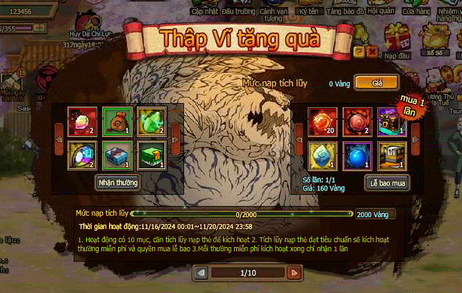 1. Hoạt động có 10 mục, cần tích lũy nạp thẻ để kích hoạt.