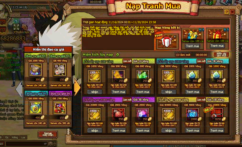 1. Trong thời gian event nạp Vàng đạt mốc chỉ định kích hoạt quyền mua đạo cụ giới hạn giảm giá: một số đạo cụ còn miễn phí nhận.