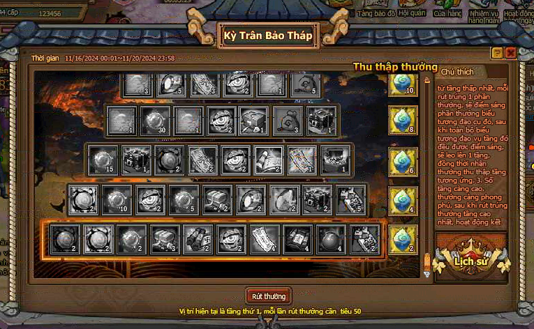 1. Từ tầng thấp nhất, mỗi rút trúng 1 phần thưởng, sẽ điểm sáng phần thưởng biểu tượng đạo cụ đó đều được điểm sáng, sẽ leo lên 1 tầng, đồng thời nhận thưởng thu thập tầng tương ứng.