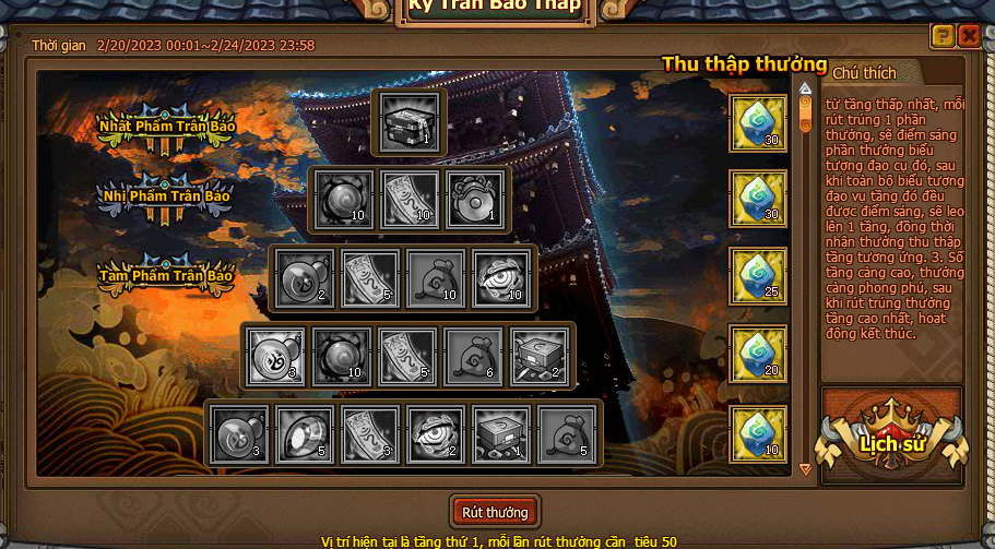 1. Từ tầng thấp nhất, mỗi rút trúng 1 phần thưởng, sẽ điểm sáng phần thưởng biểu tượng đạo cụ đó đều được điểm sáng, sẽ leo lên 1 tầng, đồng thời nhận thưởng thu thập tầng tương ứng.