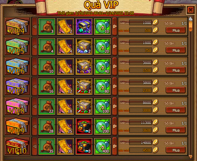 Cấp vip tương ứng sẽ được mua , mua bằng vàng hoặc lễ kim