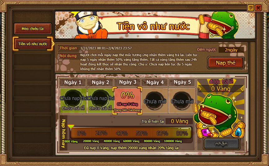1. Người chơi mỗi ngày nạp thẻ mốc tương ứng nhận thêm vàng trả lại. Liên tục nạp 5 ngày nhận thêm 80% vàng tặng thêm. Tất cả vàng tặng thêm sau 24h hoạt động kết thúc sẽ nhận thủ công. Chú ý: Chưa nạp liên tục đủ 5 ngày không thể nhận thêm 80% .