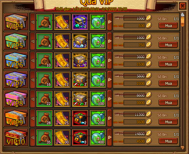 Cấp vip tương ứng sẽ được mua , mua bằng vàng hoặc lễ kim