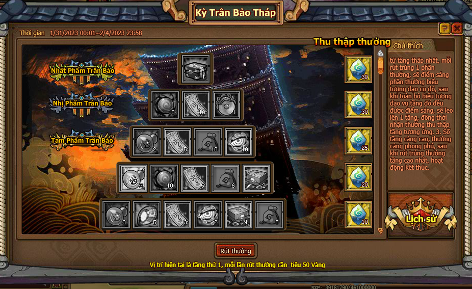 1. Từ tầng thấp nhất, mỗi rút trúng 1 phần thưởng, sẽ điểm sáng phần thưởng biểu tượng đạo cụ đó đều được điểm sáng, sẽ leo lên 1 tầng, đồng thời nhận thưởng thu thập tầng tương ứng.