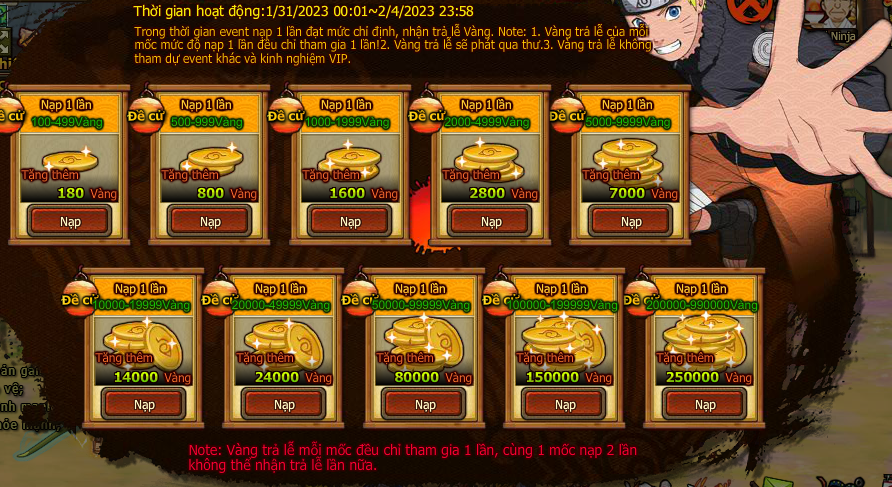 Vàng trả lễ của mỗi mốc mức độ nạp 1 lần đều chỉ tham gia 1 lần