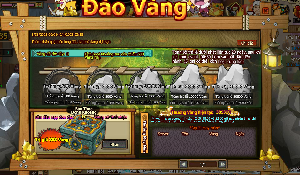 5. Trong thời gian event , nạp 1 lần đầu tiên thỏa nhận thêm bảo tàng khoáng . Trong thời gian , thống kê mức nạp của người chơi toan sv đến giải thưởng may mắn , Mổi nạp 1 Vàng giải thưởng tăng 1 Vàng , mỗi ngày 12:00, 18:00, 22:00 rút ngẫu nhiên 3 người chơi may mắn trong người chơi nạp thẻ toàn sv trả lễ Vàng