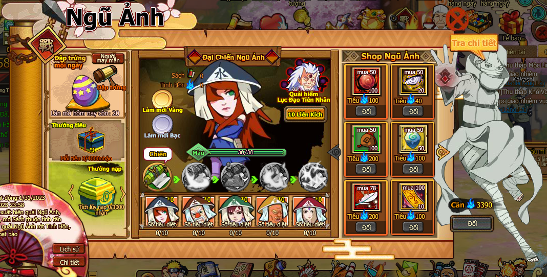 7. ở [Shop Ngũ Ảnh] tiêu [Tinh hồn] đổi các loại đạo cụ, và Ninja mới [Nữ thần nhãn] đợi bạn chiêu mộ.