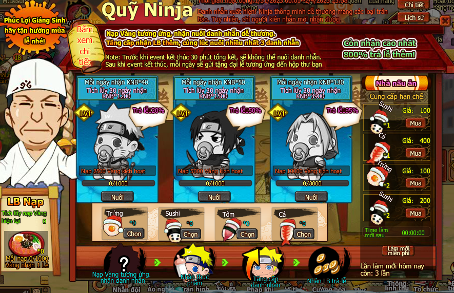 2. Tổng có 3 loại quỹ vàng ,mỗi loại trả lễ khác nhau , có thể nuôi 3 ninja
