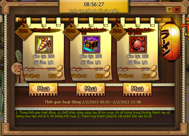 1. Trong thời gian sự kiện, có chiết khấu dùng vàng hoặc lễ kim mua, khi số lượng trong thương thành hay số lượng mua hạn chế là 0, thì không thể mua.