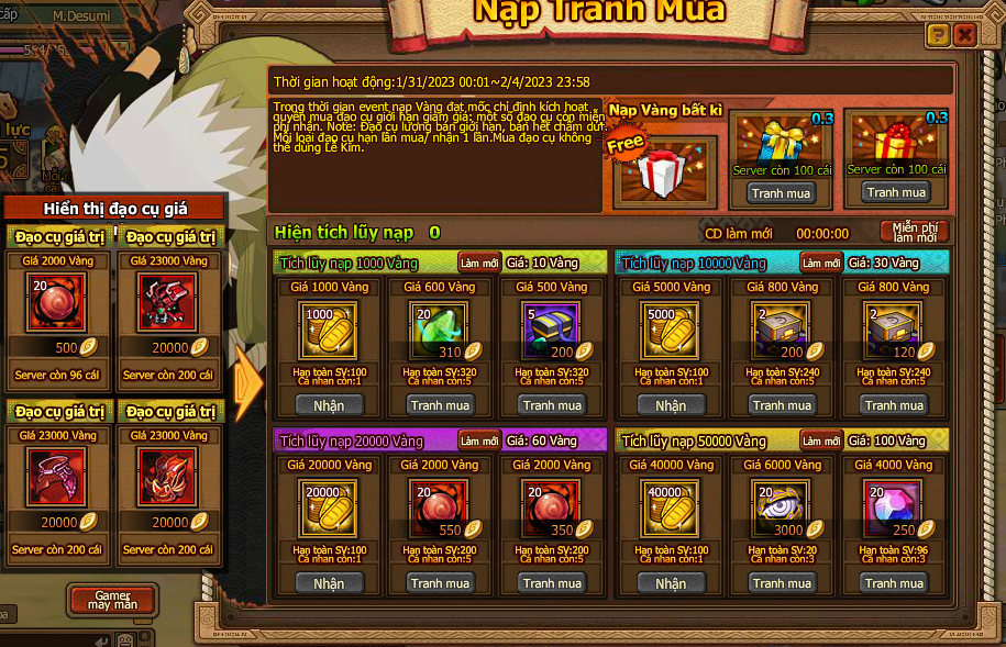 1. Trong thời gian event nạp Vàng đạt mốc chỉ định kích hoạt quyền mua đạo cụ giới hạn giảm giá: một số đạo cụ còn miễn phí nhận.