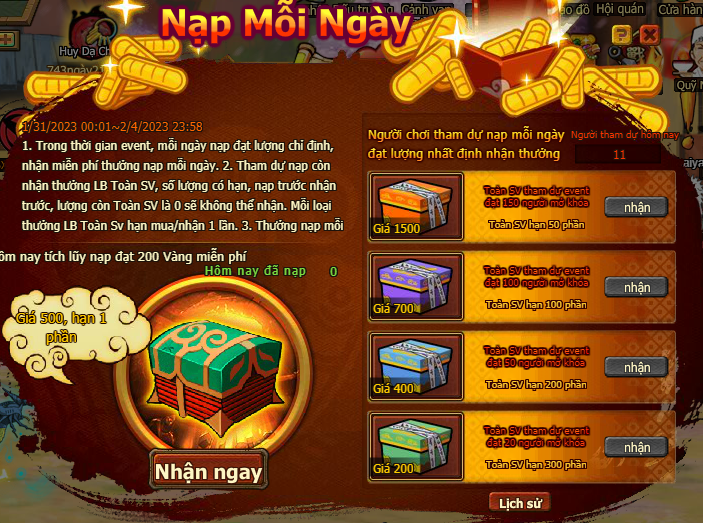 1. Trong thời gian event, mỗi ngày nạp đạt mức chỉ định, miễn phí nhận thưởng