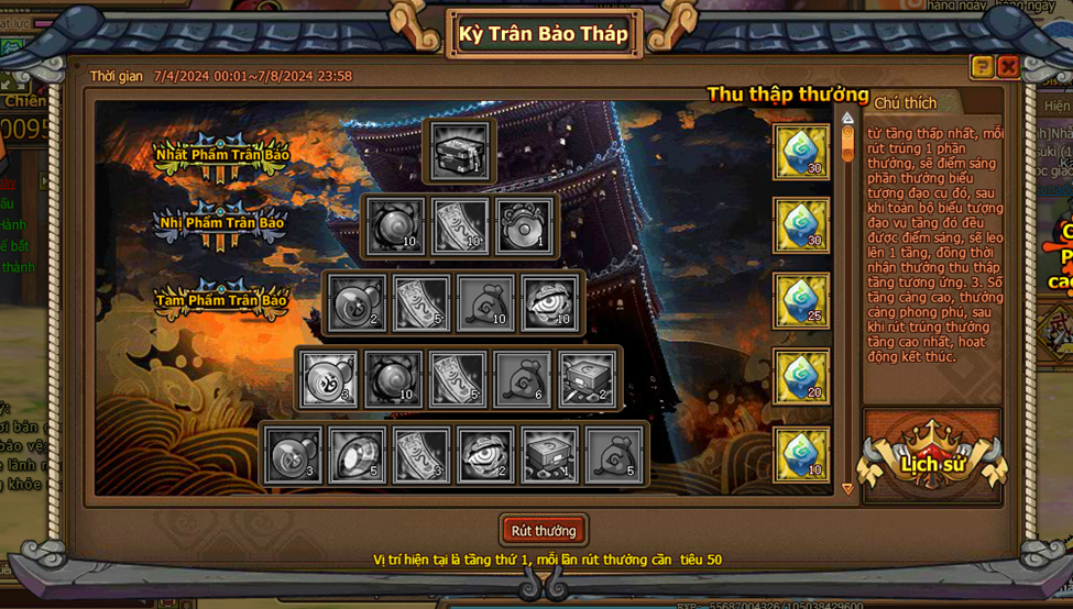 1. Từ tầng thấp nhất, mỗi rút trúng 1 phần thưởng, sẽ điểm sáng phần thưởng biểu tượng đạo cụ đó đều được điểm sáng, sẽ leo lên 1 tầng, đồng thời nhận thưởng thu thập tầng tương ứng.