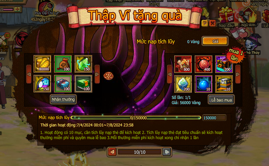 1. Hoạt động có 10 mục, cần tích lũy nạp thẻ để kích hoạt.