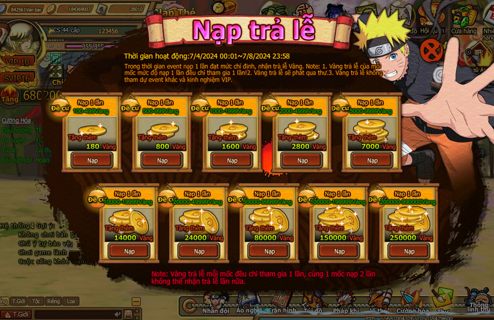 Trong thời gian event nạp 1 lần đạt mức chỉ định , nhận trả lễ vàng