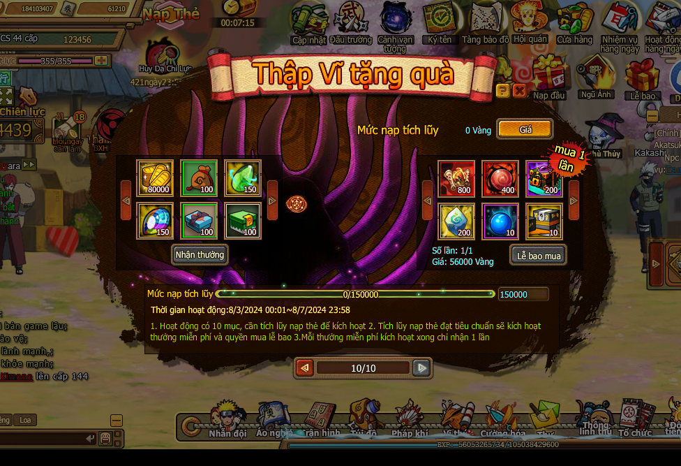 1. Hoạt động có 10 mục, cần tích lũy nạp thẻ để kích hoạt.