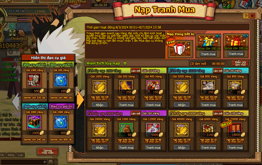 1. Trong thời gian event nạp Vàng đạt mốc chỉ định kích hoạt quyền mua đạo cụ giới hạn giảm giá: một số đạo cụ còn miễn phí nhận.