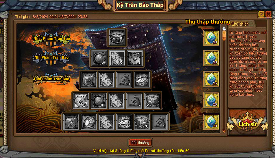 1. Từ tầng thấp nhất, mỗi rút trúng 1 phần thưởng, sẽ điểm sáng phần thưởng biểu tượng đạo cụ đó đều được điểm sáng, sẽ leo lên 1 tầng, đồng thời nhận thưởng thu thập tầng tương ứng.