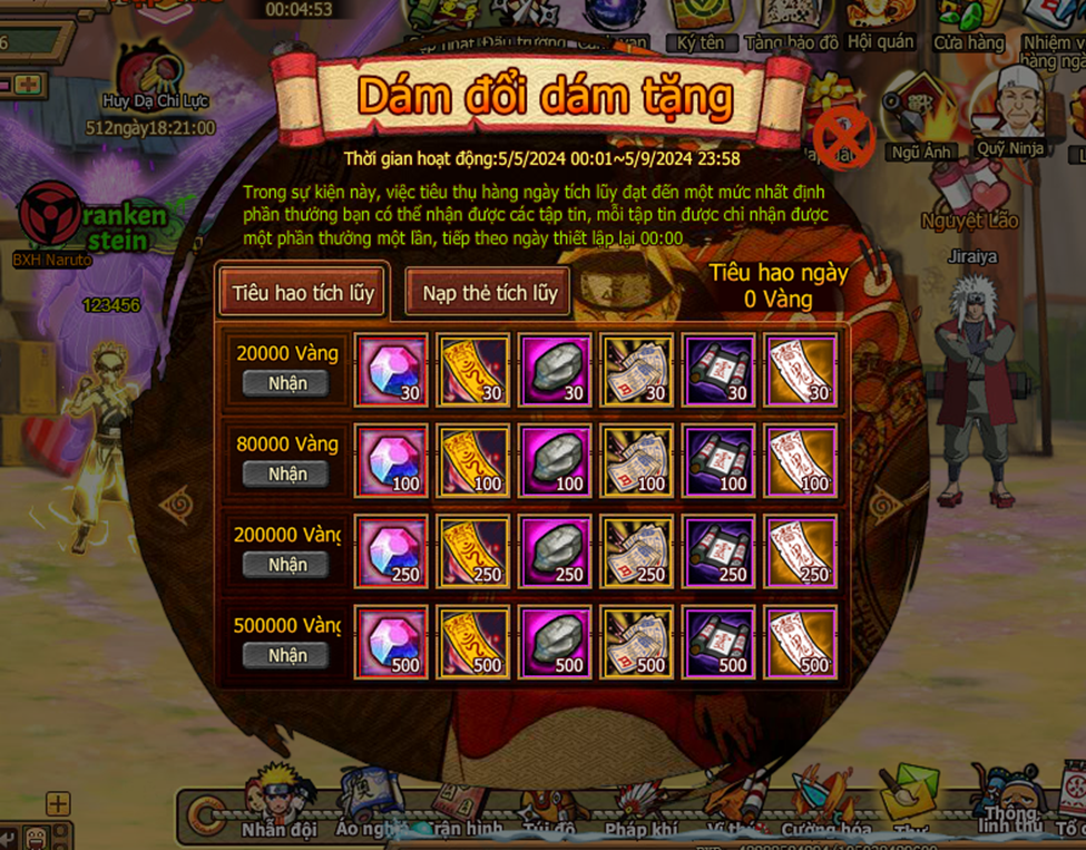 1. Người chơi nạp vàng , kích hoạt quỹ ninja : kích hoạt naruto cần nạp 1000 vàng , kích hoạt sasuke cần nạp 2000 vàng , kích hoạt sakura cần nạp 4000 vàng