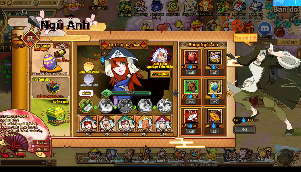 7. ở [Shop Ngũ Ảnh] tiêu [Tinh hồn] đổi các loại đạo cụ, và Ninja mới [Summer Pain] đợi bạn chiêu mộ.