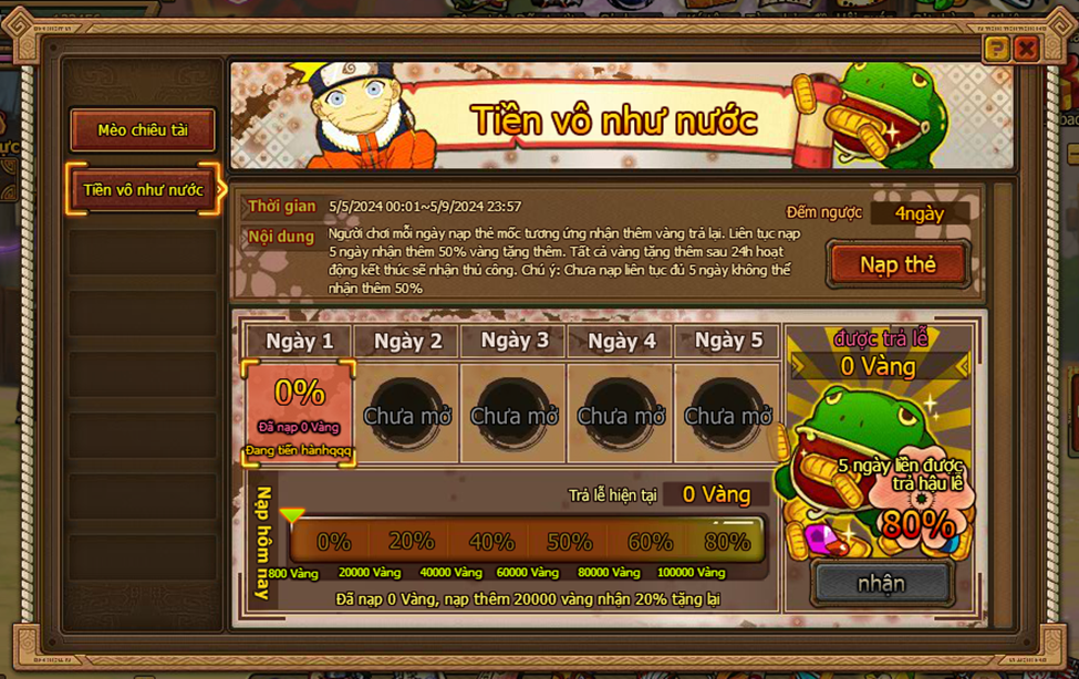 1. Người chơi mỗi ngày nạp thẻ mốc tương ứng nhận thêm vàng trả lại. Liên tục nạp 5 ngày nhận thêm 80% vàng tặng thêm. Tất cả vàng tặng thêm sau 24h hoạt động kết thúc sẽ nhận thủ công. Chú ý: Chưa nạp liên tục đủ 5 ngày không thể nhận thêm 80%.