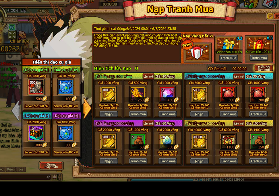 1. Trong thời gian event nạp Vàng đạt mốc chỉ định kích hoạt quyền mua đạo cụ giới hạn giảm giá: một số đạo cụ còn miễn phí nhận.