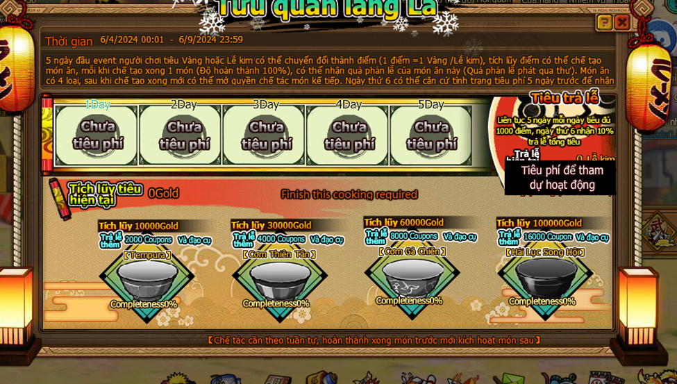 1. 5 ngày đầu event người chơi tiêu Vàng hoặc Lễ Kim có thể chuyển đổi thanh điểm ( 1 điểm = 1 vàng / lễ kim )