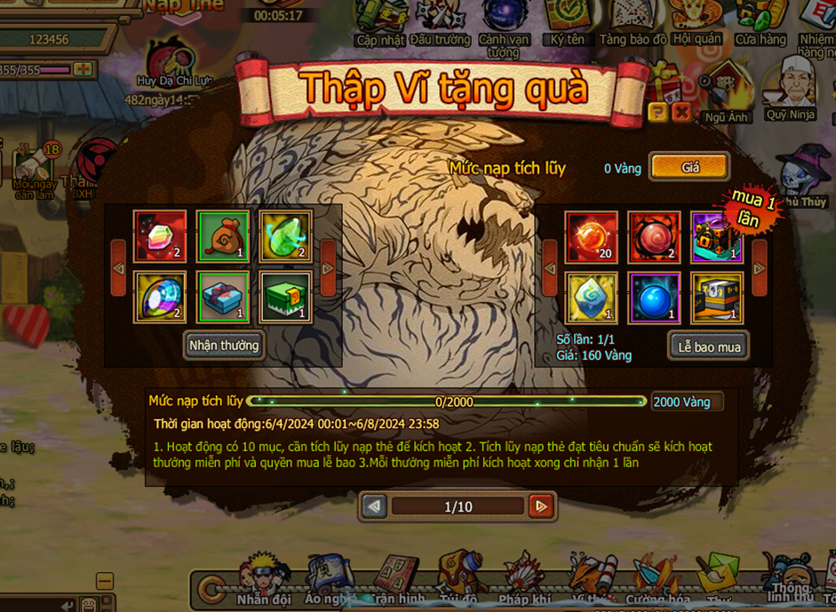 1. Hoạt động có 10 mục, cần tích lũy nạp thẻ để kích hoạt.
