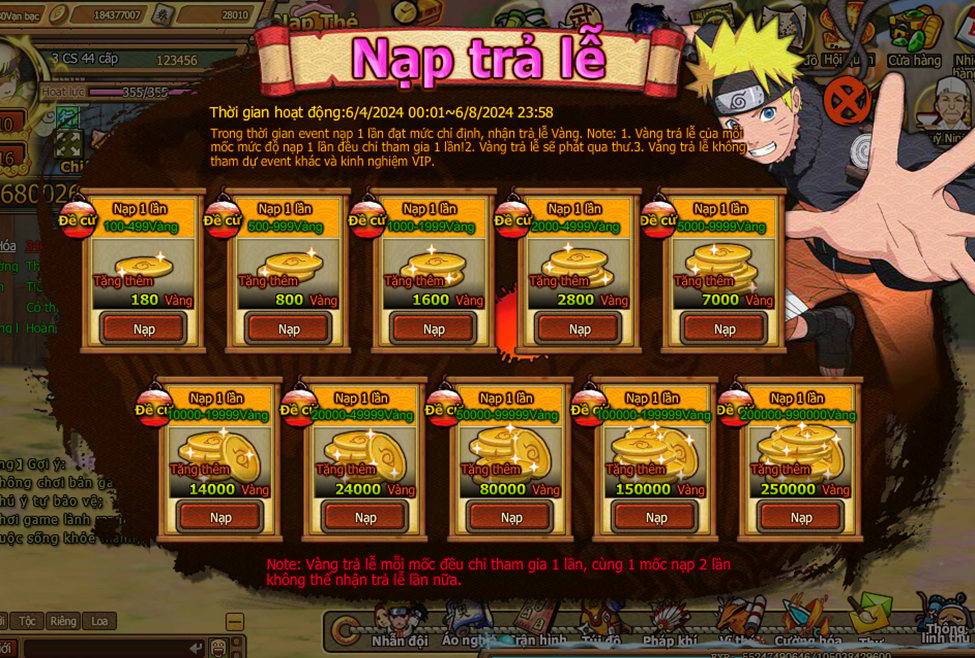 Trong thời gian event nạp 1 lần đạt mức chỉ định , nhận trả lễ vàng