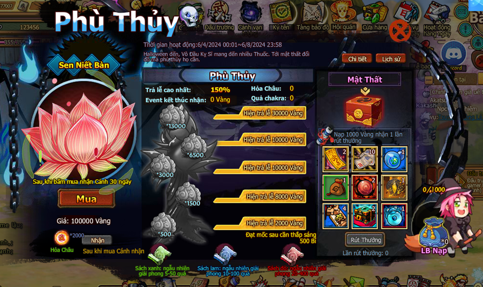 1. Người chơi nạp vàng , kích hoạt quỹ ninja : kích hoạt naruto cần nạp 2500 vàng , kích hoạt sasuke cần nạp 5000 vàng , kích hoạt sakura cần nạp 10000 vàng
