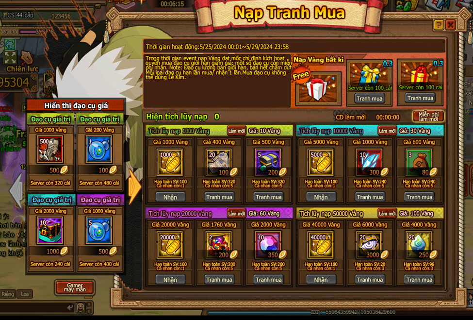 1. Trong thời gian event nạp Vàng đạt mốc chỉ định kích hoạt quyền mua đạo cụ giới hạn giảm giá: một số đạo cụ còn miễn phí nhận.