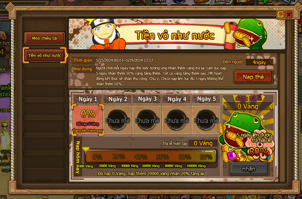 1. Người chơi mỗi ngày nạp thẻ mốc tương ứng nhận thêm vàng trả lại. Liên tục nạp 5 ngày nhận thêm 80% vàng tặng thêm. Tất cả vàng tặng thêm sau 24h hoạt động kết thúc sẽ nhận thủ công. Chú ý: Chưa nạp liên tục đủ 5 ngày không thể nhận thêm 80%.