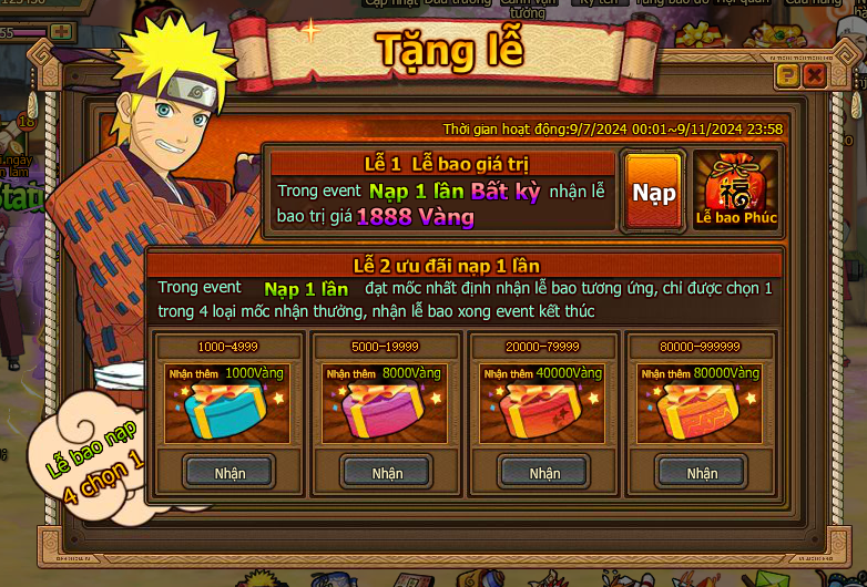 Trong thời gian event nạp 1 lần đạt mức chỉ định , nhận trả lễ vàng