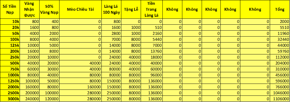 Trong thời gian event nạp 1 lần đạt mức chỉ định , nhận trả lễ vàng