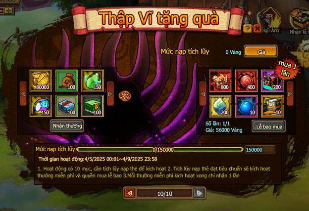 1. Hoạt động có 10 mục, cần tích lũy nạp thẻ để kích hoạt.