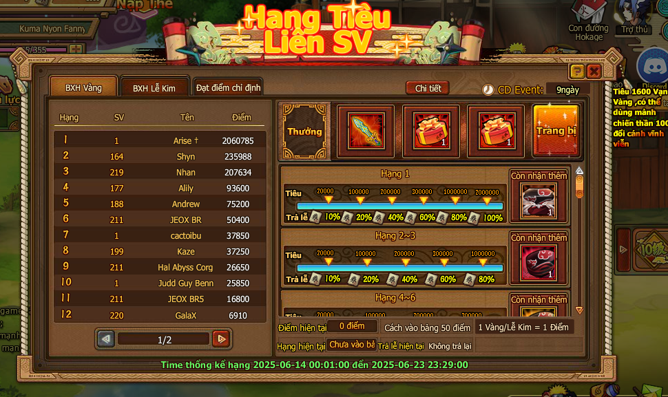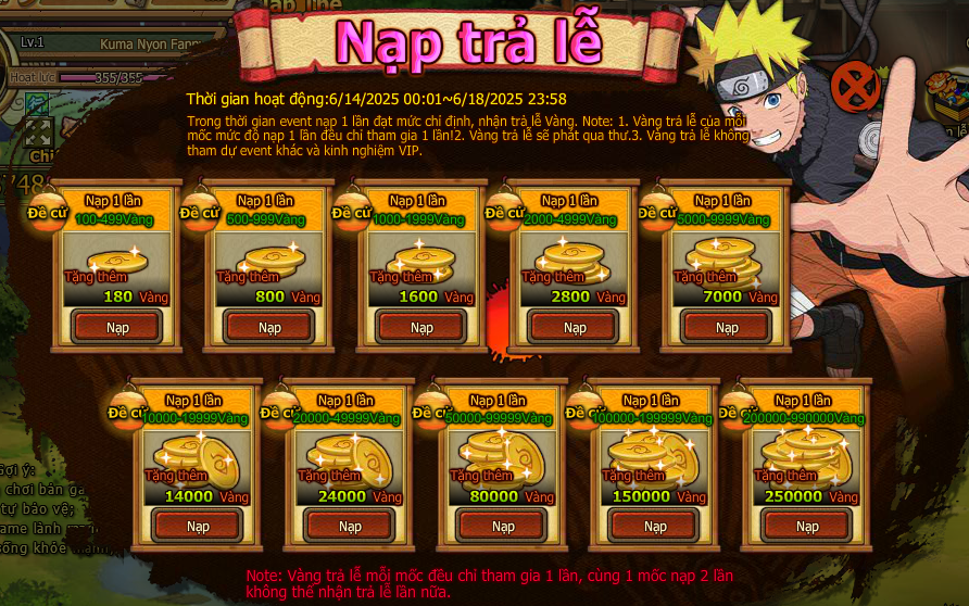 Trong thời gian event nạp 1 lần đạt mức chỉ định , nhận trả lễ vàng