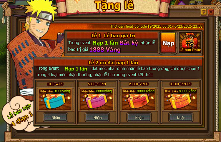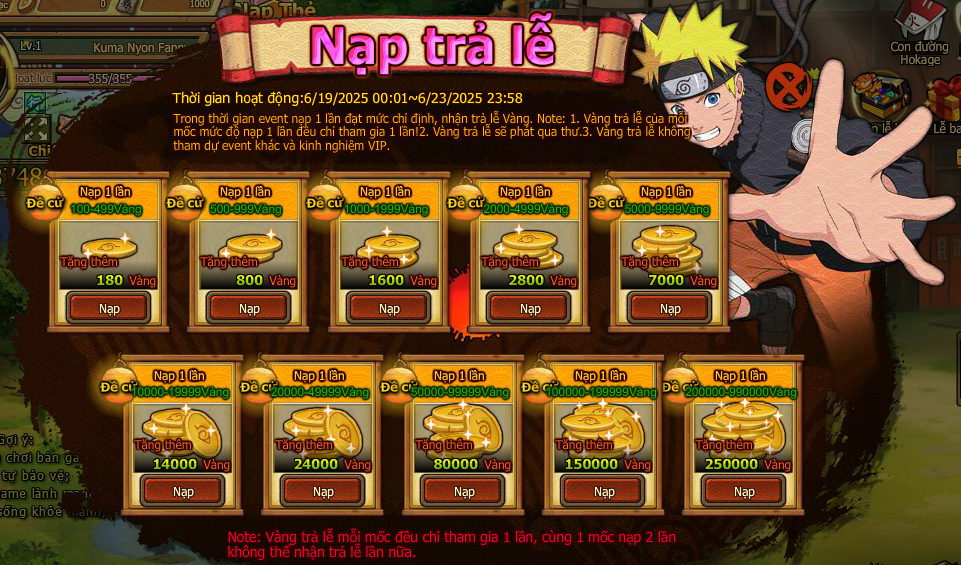 Trong thời gian event nạp 1 lần đạt mức chỉ định , nhận trả lễ vàng