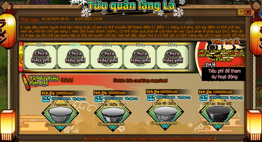 1. 5 ngày đầu event người chơi tiêu Vàng hoặc Lễ Kim có thể chuyển đổi thanh điểm ( 1 điểm = 1 vàng / lễ kim )