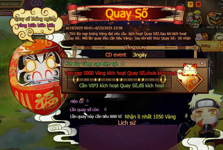 1. Trong thời gian event, người chơi nạp đủ 500 vàng nhận 1 lần cơ hội quay ( vòng quay vàng )