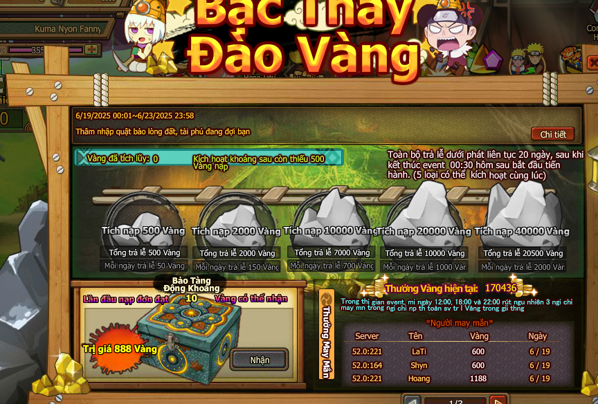 5. Trong thời gian event , nạp 1 lần đầu tiên thỏa nhận thêm bảo tàng khoáng . Trong thời gian , thống kê mức nạp của người chơi toan sv đến giải thưởng may mắn , Mổi nạp 1 Vàng giải thưởng tăng 1 Vàng , mỗi ngày 12:00, 18:00, 22:00 rút ngẫu nhiên 3 người chơi may mắn trong người chơi nạp thẻ toàn sv trả lễ Vàng
