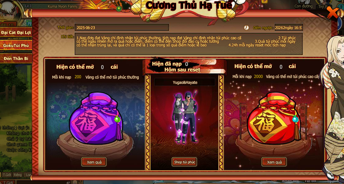 1. Nạp đơn đạt Vàng chỉ định nhận túi phúc thường, tích nạp Vàng chỉ định nhận túi phúc cao cấp.