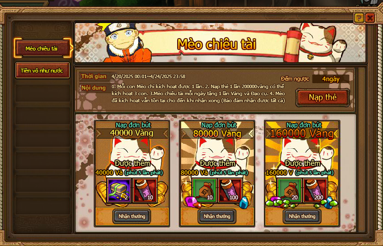 Trong thời gian event nạp 1 lần đạt mức chỉ định , nhận trả lễ vàng