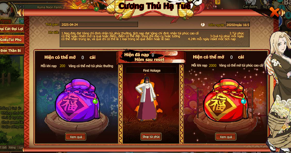 1. Nạp đơn đạt Vàng chỉ định nhận túi phúc thường, tích nạp Vàng chỉ định nhận túi phúc cao cấp.