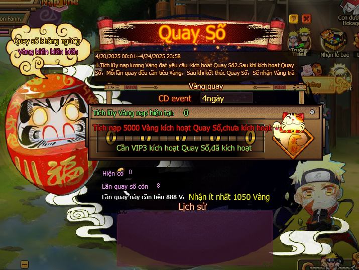 2. Sau khi kích hoạt Quay Số, Mỗi lần quay đều cần tiêu Vàng, sau khi kết thúc Quay Số, sẽ nhận Vàng trả