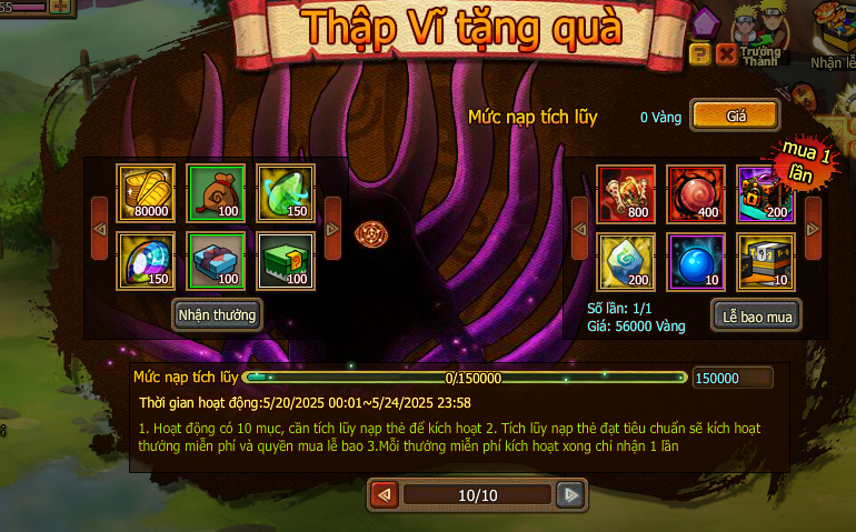 1. Hoạt động có 10 mục, cần tích lũy nạp thẻ để kích hoạt.