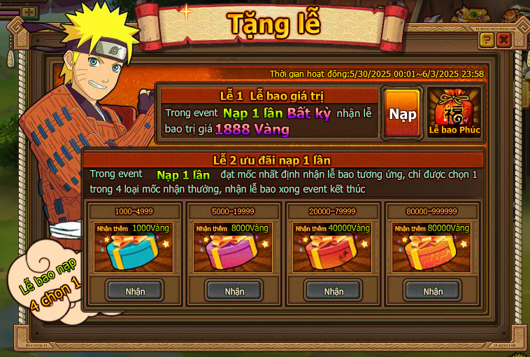 Trong thời gian event nạp 1 lần đạt mức chỉ định , nhận trả lễ vàng