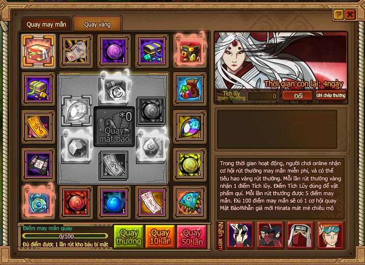 Trong thời gian hoạt động, người chơi online nhận cơ hội rút thưởng may mắn miễn phí, và có thể tiêu hao vàng và lễ kim rút thưởng. Mỗi lần rút thưởng vàng nhận 1 điểm tích lũy. Điểm Tích Lũy dùng để vật phẩm quý. Mỗi lần rút thưởng được 5 điểm may mắn. Đủ 100 điểm may mắn sẽ có 1 cơ hội quay Mật Bảo