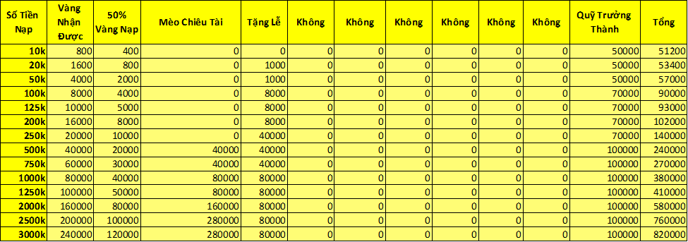 Trong thời gian event nạp 1 lần đạt mức chỉ định , nhận trả lễ vàng